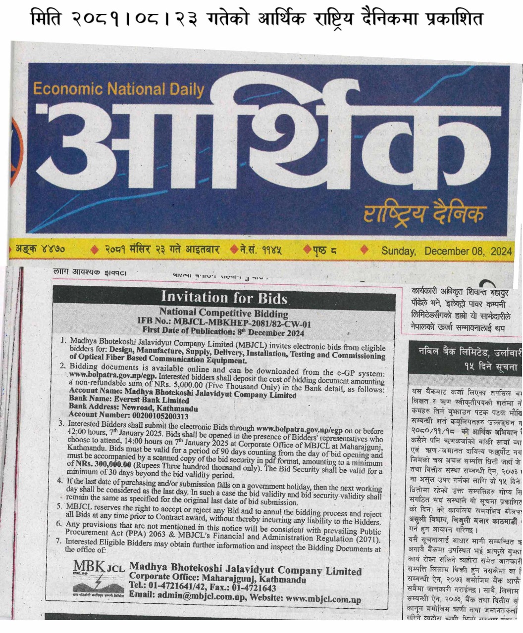 Last Date of submission : 23 Paush 2081 12:00 Hours BS Bid Opening : 23 Paush 2081 14:00 Hours BS |